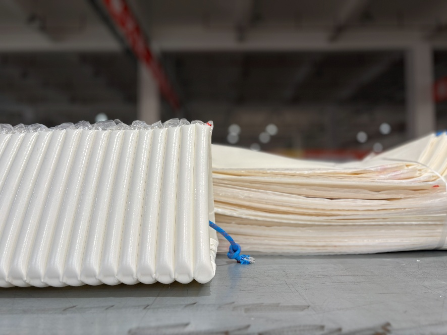 这是本次升级最直观的体现。传统扰流条是固定体积的刚性体,而润阳科技的升级产品采用一体式结构。此设计使产品在运输与存储时处于未充气的片状形态,可紧密卷起或折叠,单柜运输量提升超过300%,运输成本降低约77%。抵达现场后,可快速充气激活,形成具备预设外形与刚度的稳定结构,实现从“仓库货架”到“塔筒顶端”的无缝、高效流转。