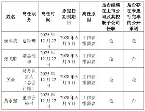 公司董事会于2025年12月22日收到公司总经理侯军虎先生、副总经理张戈临先生、财务负责人(总会计师)吴豪先生、董事会秘书黄永坚先生的辞职报告。因公司工作安排需要,侯军虎先生不再兼任公司总经理职务,张戈临先生不再担任公司副总经理职务,吴豪先生不再担任公司财务负责人(总会计师)职务,黄永坚先生不再担任公司董事会秘书职务,以上申请自辞职报告送达公司董事会之日起生效。