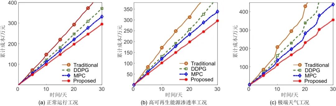 图3给出了多场景下的优化累积成本的比较,给出了3个新特征:首先,正常工作条件下的传统方法[图3(a)]表现出轻微的非线性增长,30天内的累积成本为3287000元,而融合方法保持准线性增长,最终成本为2675000元,成本差异比前一种低18.6%。其次,高穿透场景[图3(b)]的波动控制在±6%以内,融合方法在第15天的成本波动方差(12.3)仅为传统方法(58.7)的21%,这验证了其鲁棒性。极端天气情景[图3(c)]的数据给出,离散冲击导致传统方法的成本逐步增加,三次冲击分别导致永久成本增加30万元、50万元和70万元,而融合方法仅分别增加9万元、15万元和21万元。特别是,在第25天的强烈冲击之后,传统方法的成本增长率从每天4.2%上升到5.8%,而融合方法的成本增长率仅从3.1%上升到3.3%。以上数据揭示了2个重要结论:①融合方法表现出自适应调整,冲击后的成本回收率比传统方法高2.1倍;②MPC方法在连续冲击下表现出控制衰减,第三次冲击后的成本增长率比第一次冲击高38%,而聚变方法仅高6%。这些发现证明了融合方法在复杂场景中的持续有效性。