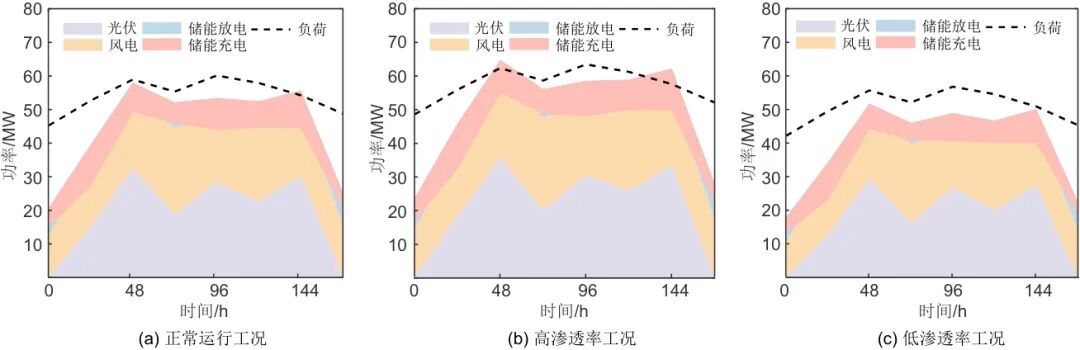 图5给出了本文提出的方法在工业园区一周内的负载平衡中的出色性能。该图采用堆叠面积图的形式,清楚地给出了太阳能、风能和储能系统与负载之间的动态平衡关系。从图中可以看出,太阳能发电呈现出明显的周期性变化,一周内最高发电量达到32.56 MW,最低为0 MW,这反映了太阳能发电的间歇性。而风力发电相对稳定,在12.45~25.89 MW之间波动,为系统提供了相对连续的能源供应。储能系统的充放电在平衡供需方面起着关键作用,最大放电功率为9.34 MW,最大充电功率为12.34 MW,有效缓解了可再生能源的波动。本文提出的方法在负载平衡方面表现良好,如图5中的黑色虚线所示,该系统能够准确跟踪负载分布,负载需求在45.23~60.12 MW之间波动。通过比较可再生能源的输出和负载需求可以发现,本文的方法能够将可再生能源的利用率提高到91.27%,比传统方法高15.35%,这充分证明了该方法在提高能源利用效率和系统稳定性方面的优势。