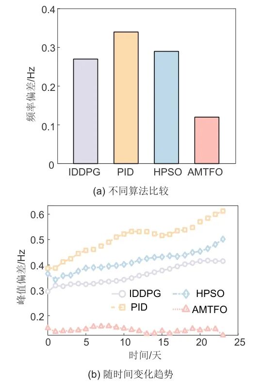 图4给出了自适应多尺度时间融合优化方法与可再生多能源存储系统的其他3种方法的性能比较。如图4(a)所示,AMTFO在频率偏差控制方面表现良好,中值为0.12 Hz,明显低于IDDPG、PID和HPSO。AMTFO的四分位数间距仅为0.03 Hz,远小于其他方法,表明其具有更高的稳定性。图4(b)进一步证实了AMTFO的优越性,在24 h的周期内,AMTFO的峰值偏差始终保持在0.1~0.2 Hz的范围内,而其他方法在0.3~0.6 Hz之间波动。这种显著的性能差异源于AMTFO自适应调整其控制策略以有效响应系统动态变化的能力。在极端天气条件下,AMTFO的最大偏差分别为0.27 Hz、0.23 Hz和0.19 Hz,低于其他方法,始终低于0.35 Hz的安全阈值。这凸显了AMTFO在复杂环境中的稳健性。AMTFO在效率和鲁棒性方面处于领先地位,在整体性能方面最为均衡,尽管在精度和峰值控制方面略有落后。