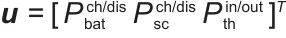 是状态向量,包含储能单元的充电状态和可再生能源输出,其中Ebat表示储能电池的能量状态,Esc表示超级电容器的能量状态,Eth表示热储能的能量状态,Pwt表示风机的输出功率,Ppv表示光伏的输出功率;B表示输入矩阵,体现控制输入向量u(t)对状态向量x(t)变化的影响关系;u(t)表示t时刻的控制输入向量,