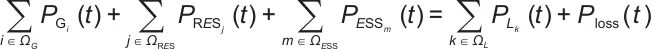 表示时刻t第m个储能装置的功率交互量(储能装置含锂电池、超级电容器、储热装置等,通过电-热/电转换参与电网功率交互,充电时为负、放电时为正);ΩESS表示储能装置集合,下标