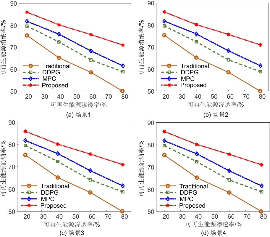 图2给出了不同算法在可再生能源消纳率方面的性能比较。从图中可以看出,随着可再生能源渗透率从20%提高到80%,传统方法的新能源消纳率从75.32%急剧下降到49.83%,这反映了传统方法对高比例可再生能源并网的适应性有限。相比之下,本文提出的算法表现出了出色的鲁棒性,在80%的高渗透率下保持了70.92%的新能源消纳率,比传统方法高21.09%。实验数据揭示了2个重要现象:①所提出的算法在中等渗透率区间表现出独特的性能优势,在40%的渗透率下,消纳率达到80.15%,比MPC算法同期数据高4.26%,这归因于该算法对间歇性可再生能源的预测和补偿机制。②在极端情况下,与DDPG和MPC相比,本文所提出的算法分别具有12.16%和9.49%的性能优势,这验证了其自适应优化策略的有效性。值得注意的是,随着渗透率的增加,算法之间的性能差异呈非线性扩展趋势。在20%的渗透率下,最佳和最差算法之间的差距为10.61%;在80%的渗透率下,差距扩大到21.09%。这种发散趋势表明,本工作所提出的算法可以通过动态约束处理和多时间尺度优化更好地应对高渗透率引起的系统不确定性,为新的电力系统提供了可靠的技术解决方案。