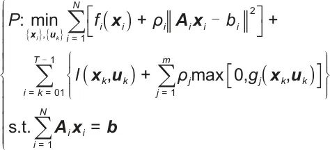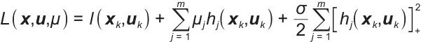表示向量(或矩阵)的二范数平方;T表示另一个求和上限,代表优化时域(比如预测控制中的预测步数)内的离散时间点数量;l(xk,uk)表示关于状态变量xk和控制变量uk的瞬时损失(或成本)函数;m表示又一求和上限,对应不同的约束违反情况数量;ρj表示针对第j个不等式约束的惩罚系数(或称为障碍函数系数),用于处理不等式约束gj(xk,uk)≤0,当约束被违反(即gj(xk,uk)>0)时,通过max[0,gj(xk,uk)]转化为惩罚项加入目标函数,ρj调节该惩罚的力度;gj(xk,uk)表示第j个不等式约束函数,是关于状态xk和控制uk的函数,用于限制系统运行在可行域内(如设备功率上限、状态变量范围等),要求gj(xk,uk)≤0。