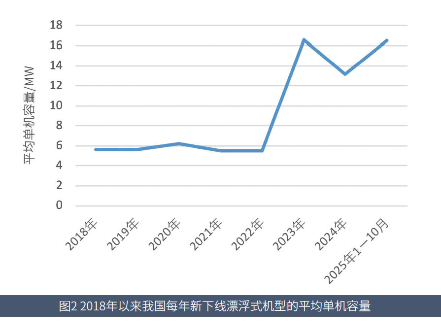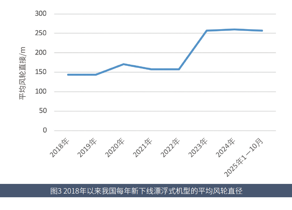 每年新下线漂浮式机型的平均风轮直径在2023年前不足171m,到2023年迅速提升至257.3m,2024年为260.3m,2025年1―10月新下线机型的平均风轮直径与2023年相当。