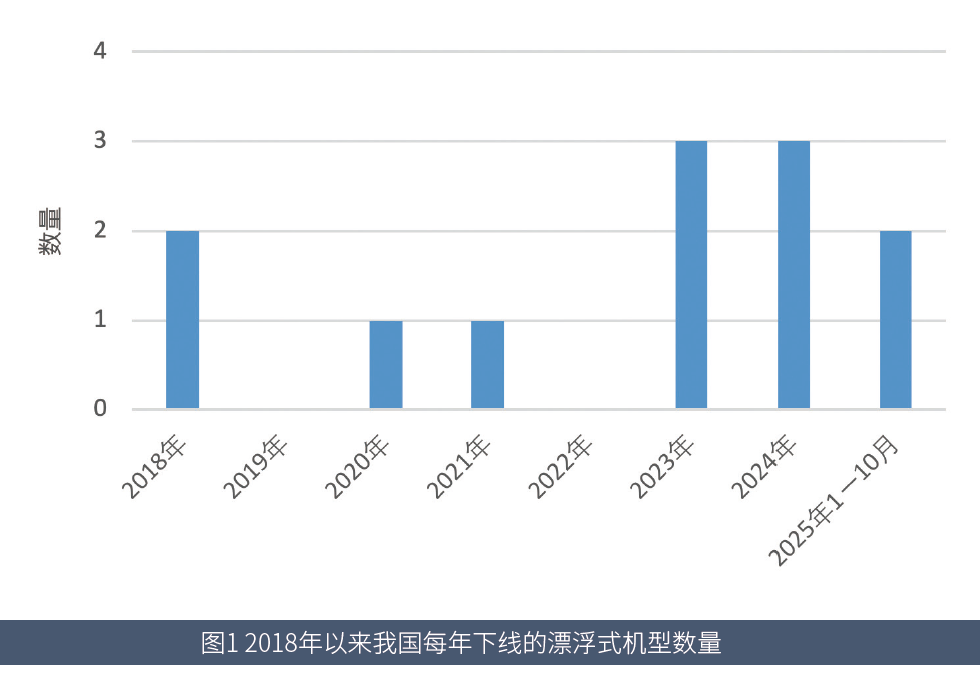 这些漂浮式风电机组的下线时间主要集中于近些年,尤其是2023年和2024年,漂浮式机组的下线机型分别达到3款,2025年1―10月有2款。