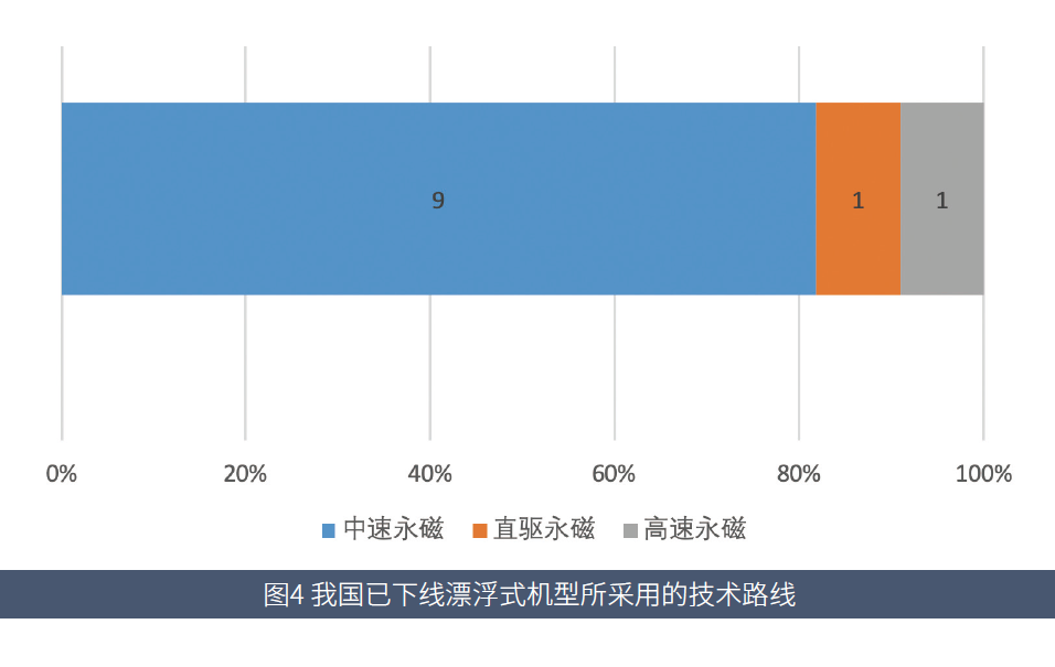 在技术路线上,我国已下线的80%以上漂浮式风电机组采用了中速永磁(半直驱/混合)技术,仅有中船海装的6.2MW机型采用高速永磁技术,东方电气的17MW机型采用直驱永磁技术。