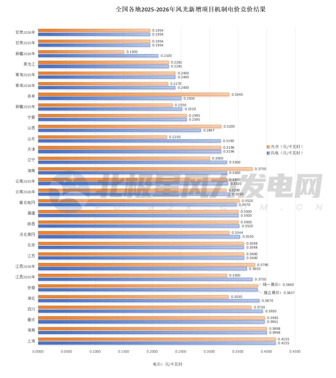 2025年至2026年新增风光项目机制电价最低出现在甘肃。