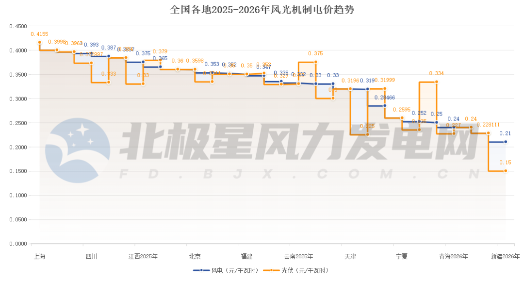 在用电需求旺盛、资源条件好的地区,风电电价依然坚挺,如上海、浙江、福建,但在一些资源集中但本地消纳能力有限的地区,如新疆、青海、甘肃,低价竞争激烈,电价已降至较低水平。