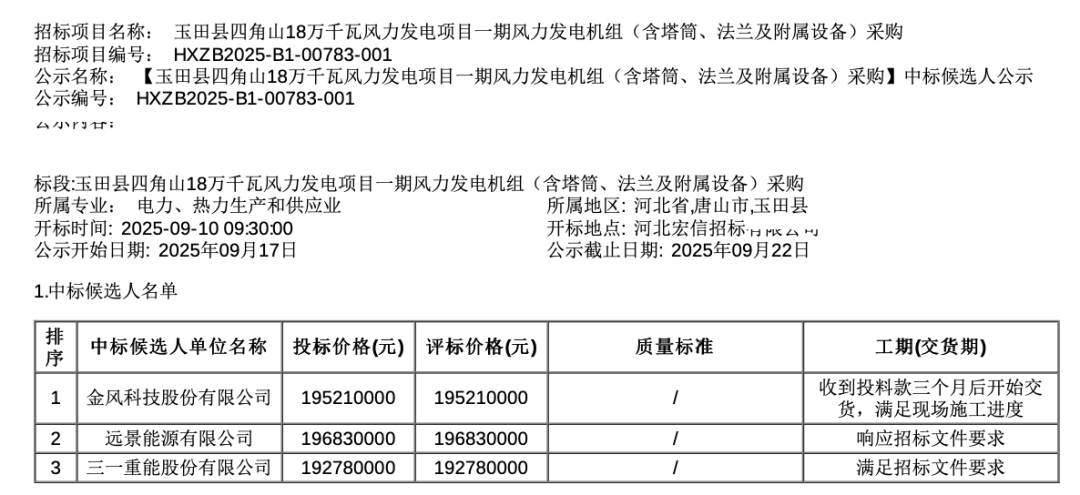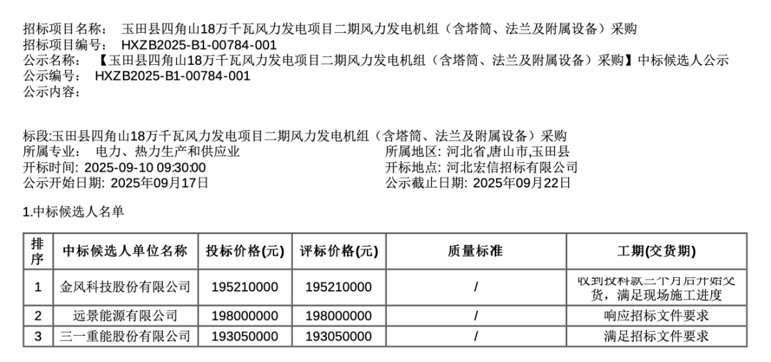 中标候选人第一名:金风科技,投标报价:19521万元。