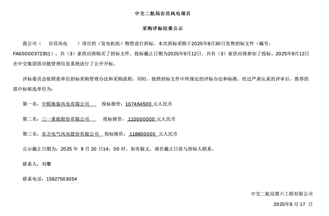 中标候选人第一名:东方风电,投标报价:20650万元。