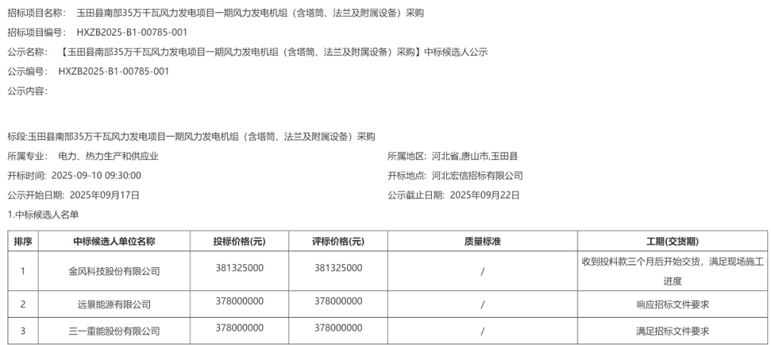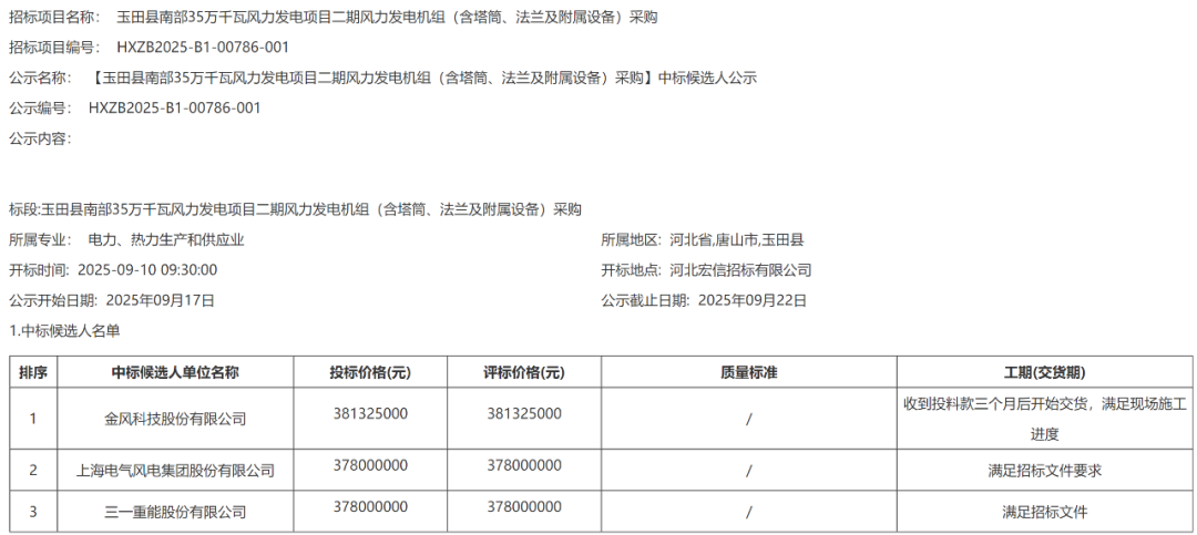 中标候选人第一名:金风科技,投标报价:38132.5万元。