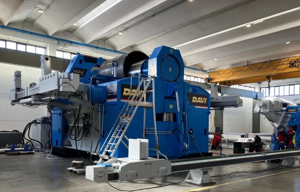 更值得关注的是,本次设备搭载了全球领先的 Davi Smart-line锥管卷制技术,该技术以 “连续轧制” 为核心,搭配扩展式进料输送机与 CNC 全控专利液压导向系统,成功实现了锥管的自动连续卷制功能,告别了传统 “预画线 + 多次停顿调整” 的繁琐流程,较传统工艺效率提升超 80%,是当前欧洲海上风电基础制造中领先的卷制工艺技术。