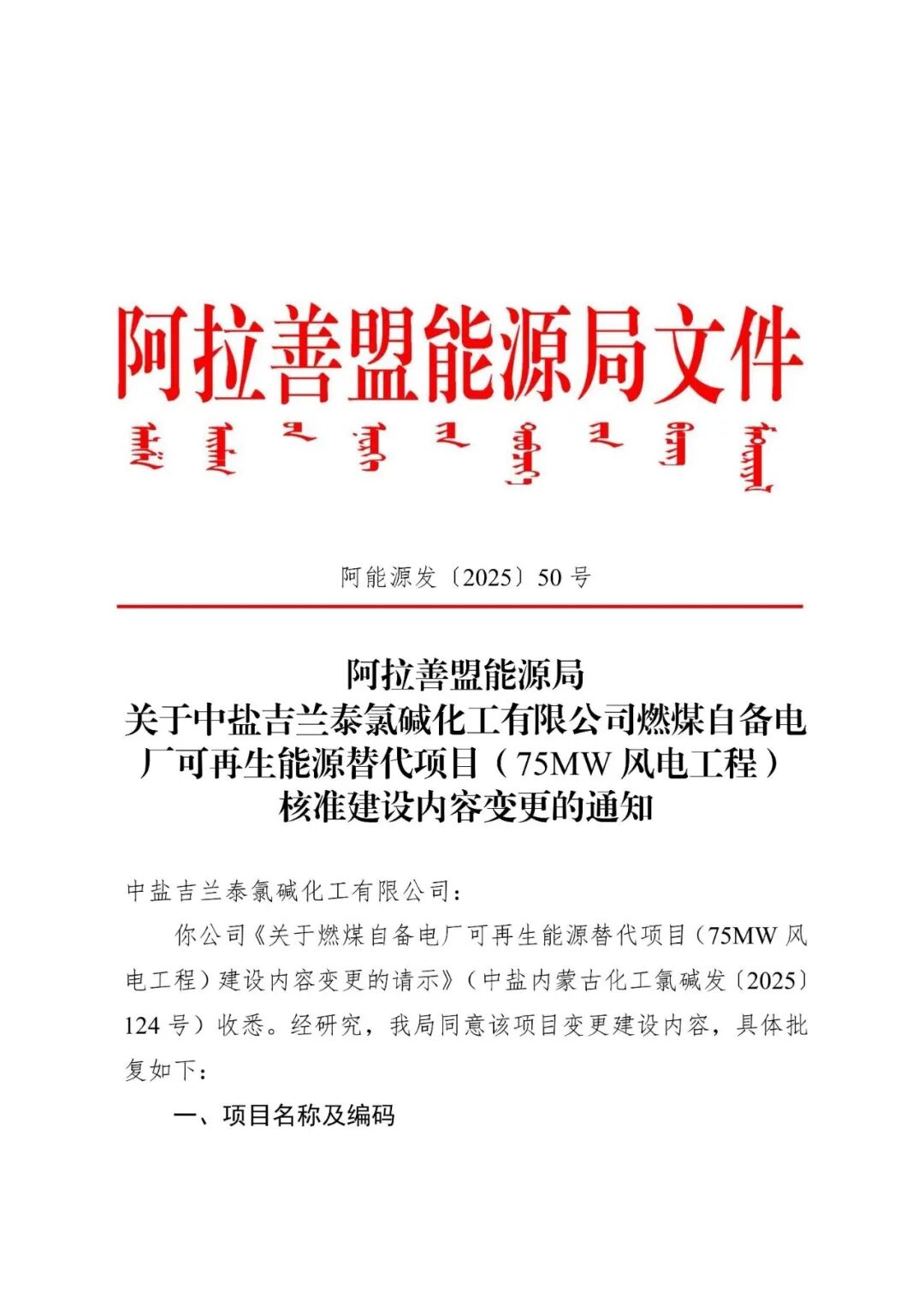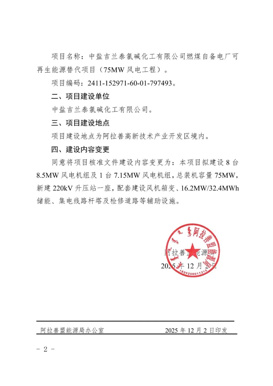 中盐吉兰泰氯碱化工有限公司燃煤自备电厂可再生能源替代项目(75MW风电工程)建设地点为阿拉善高新技术产业开发区境内,核准变更后拟建设8台8.5MW风电机组及1台7.15MW风电机组,总装机容量75MW,新建220kV升压站一座,配套建设风机箱变、16.2MW/32.4MWh储能、集电线路杆塔及检修道路等辅助设施。项目建设单位为中盐吉兰泰氯碱化工有限公司。
