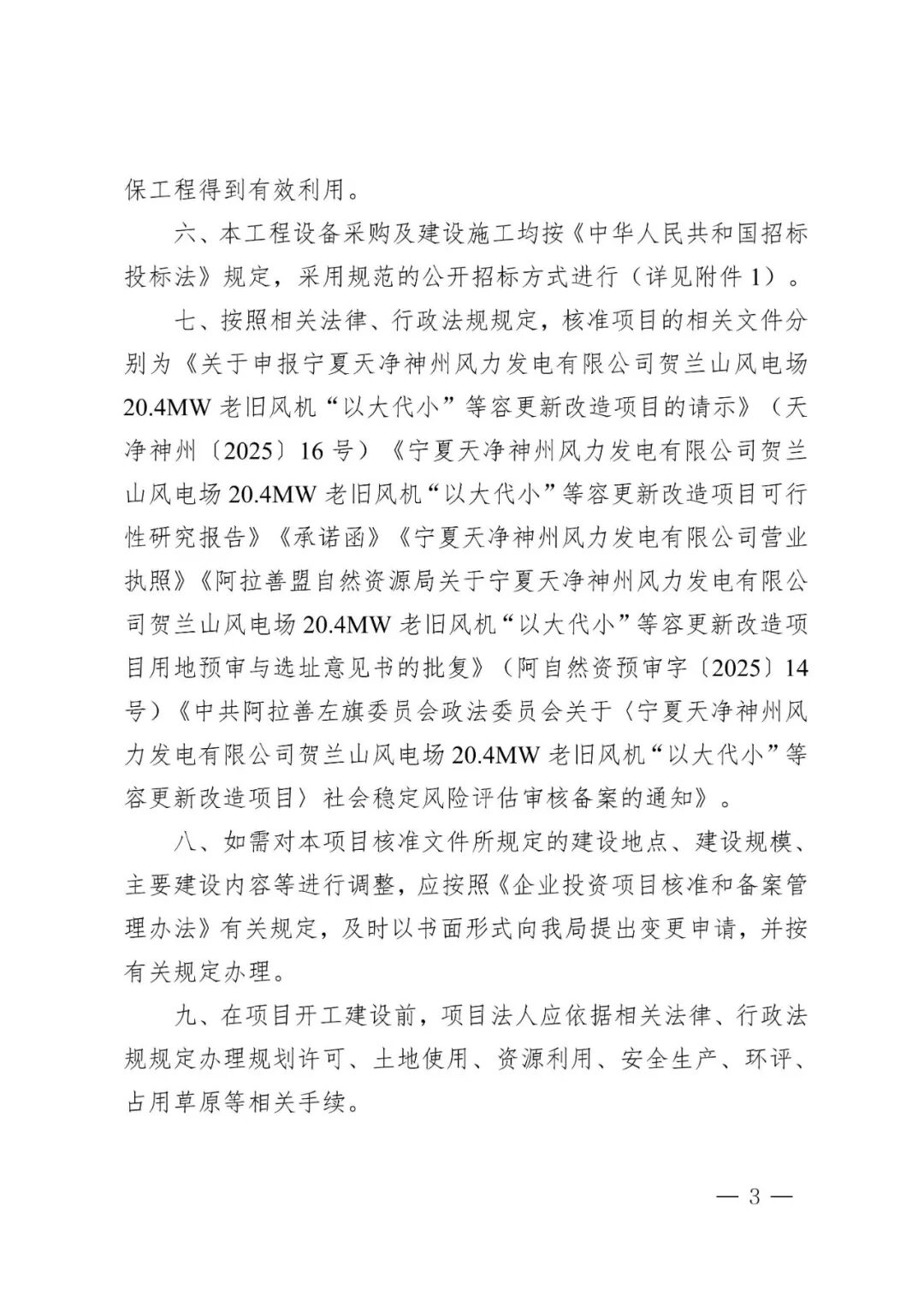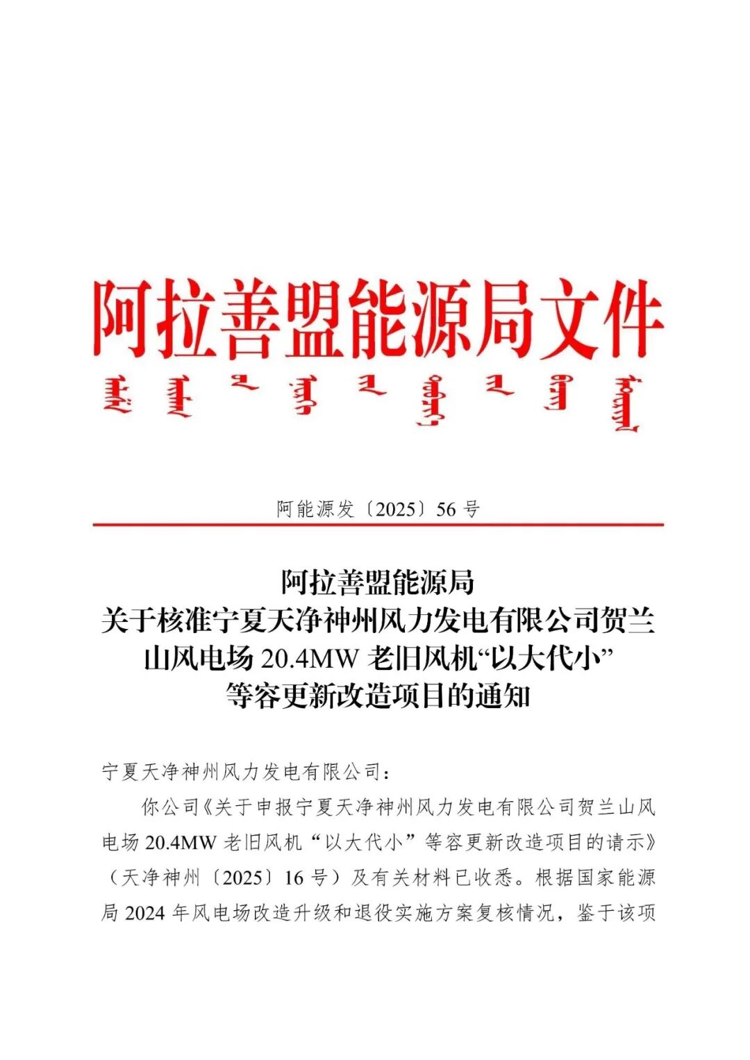 宁夏天净神州风力发电有限公司贺兰山风电场20.4MW老旧风机“以大代小”等容更新改造项目位于内蒙古自治区阿拉善盟阿拉善左旗巴润别立镇境内,通过技术改造方式,对宁夏天净神州风力发电有限公司贺兰山风电场20.4MW项目24台850kW老旧风机进行等容改造。项目改造容量20.4MW,拆除现有24台850kW老旧风机,等容量新建4台单机容量5MW的风力发电机组,配套建设箱变、检修道路等辅助设施,对原有10kV集电线路进行改造后接入现有110kV升压站。项目单位为宁夏天净神州风力发电有限公司,总投资为7924万元。
