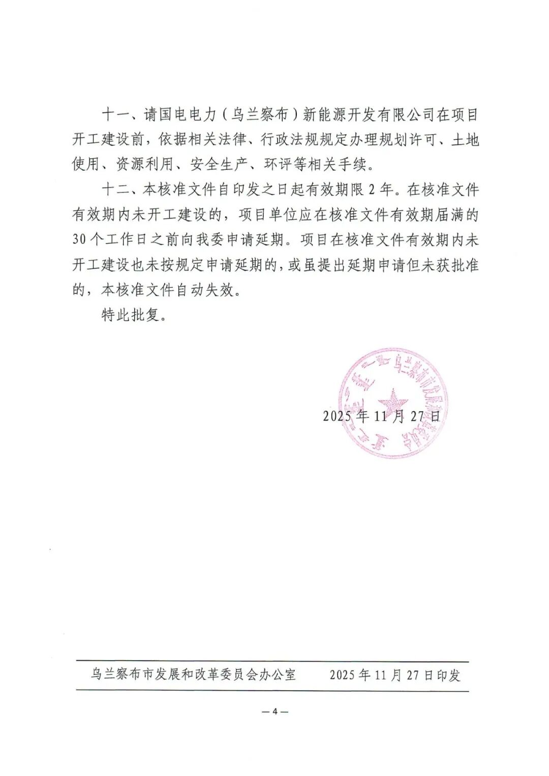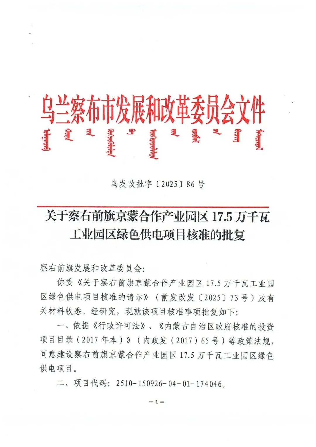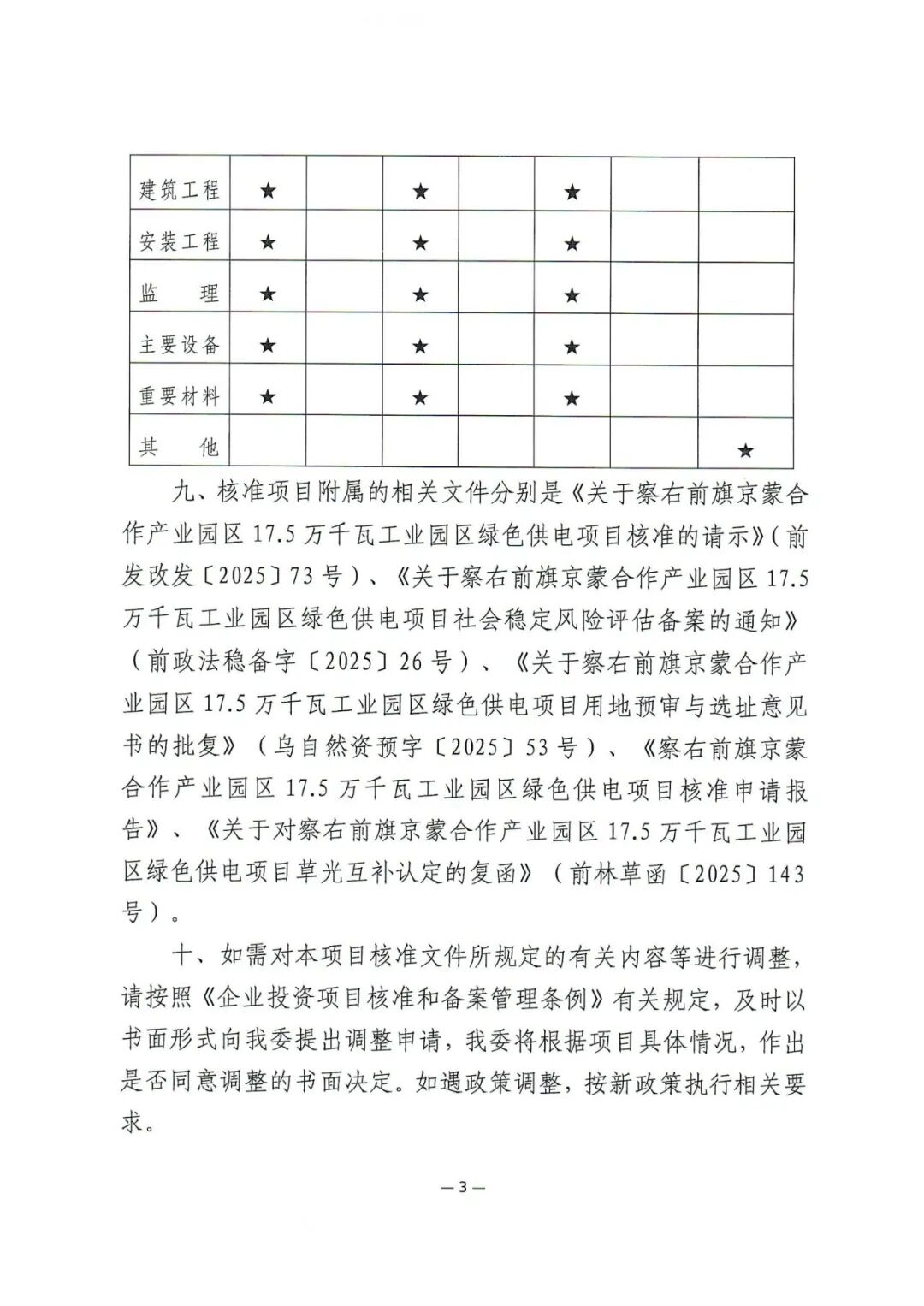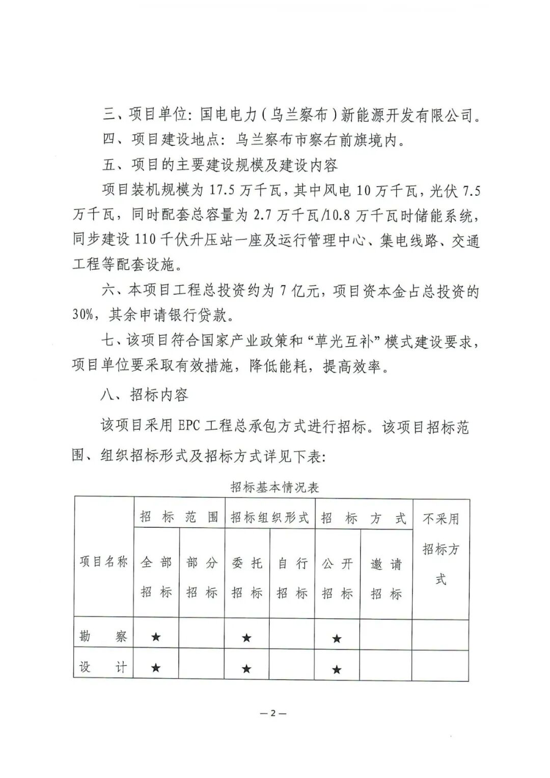 察右前旗京蒙合作产业园区17.5万千瓦工业园区绿色供电项目位于乌兰察布市察右前旗境内,装机规模为17.5万千瓦,其中风电10万千瓦,光伏7.5万千瓦,同时配套总容量为2.7万千瓦/10.8万千瓦时储能系统,同步建设110千伏升压站一座及运行管理中心、集电线路、交通工程等配套设施。项目单位为国电电力(乌兰察布)新能源开发有限公司,总投资约为7亿元。