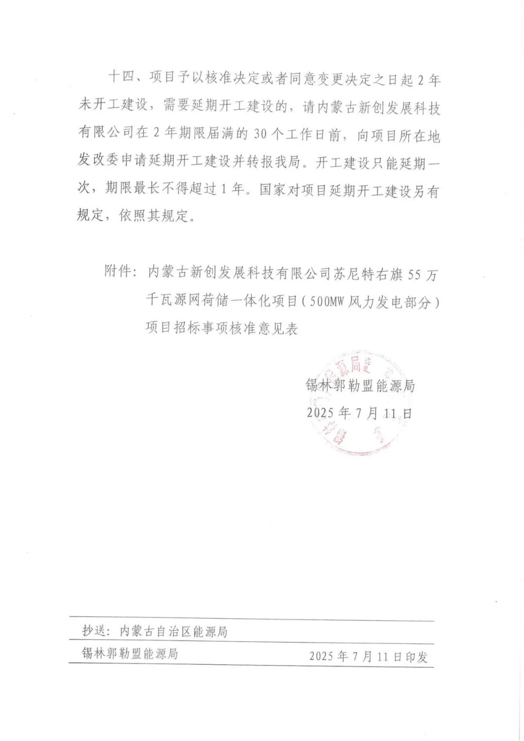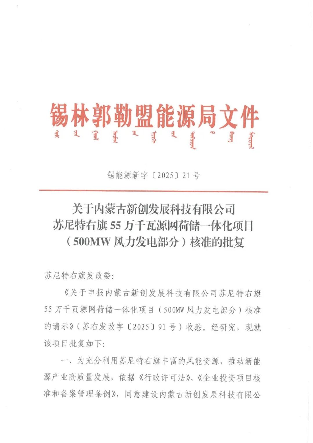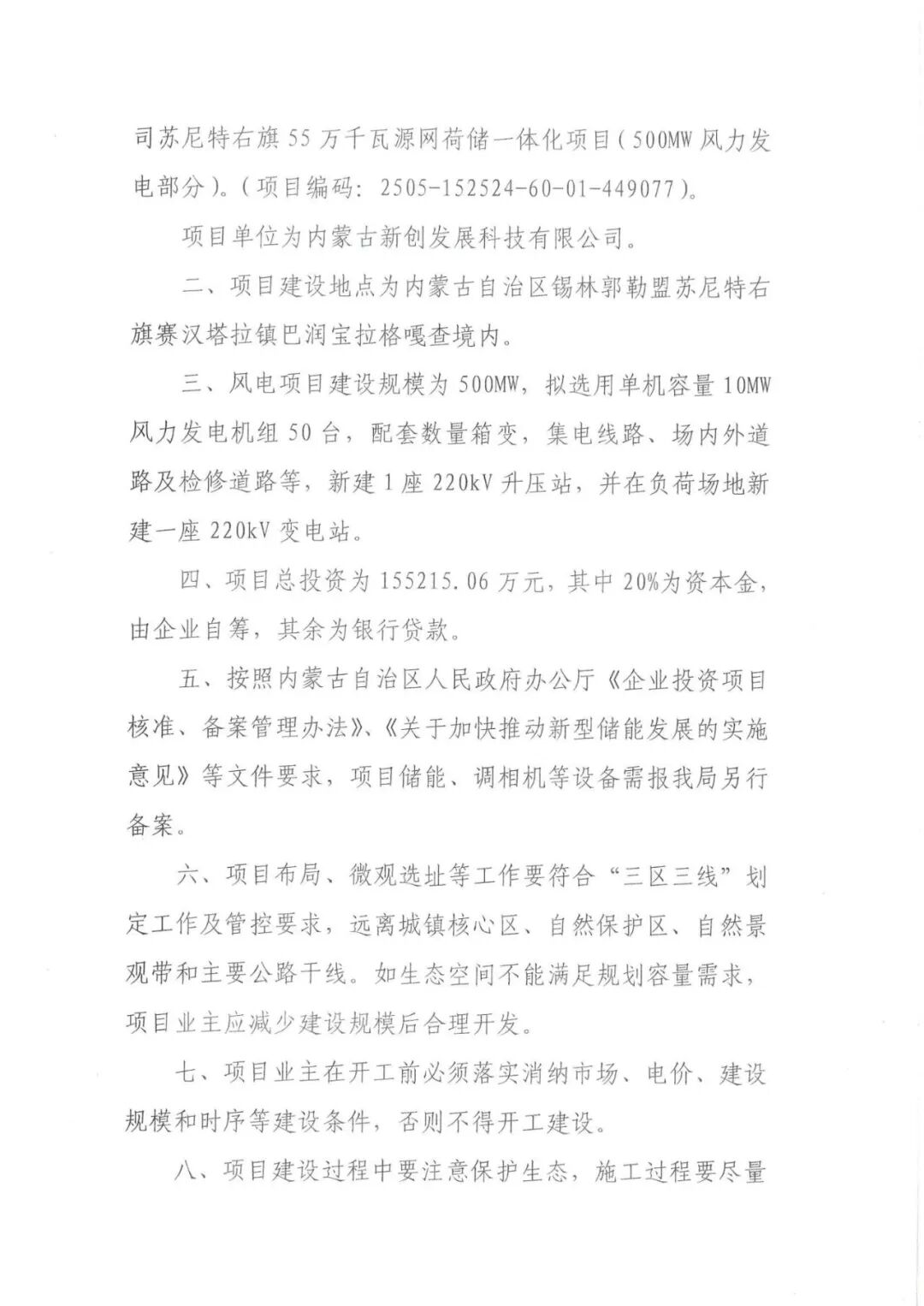 内蒙古新创发展科技有限公司苏尼特右旗55万千瓦源网荷储一体化项目(500MW风力发电部分)位于内蒙古自治区锡林郭勒盟苏尼特右旗赛汉塔拉镇巴润宝拉格嘎查境内,建设规模为500MW,拟选用单机容量10MW风力发电机组50台,配套数量箱变,集电线路、场内外道路及检修道路等,新建1座220kV升压站,并在负荷场地新建一座220kV变电站。项目投资主体为新创智汇能源科技(内蒙古)有限公司,总投资为155215.06万元。