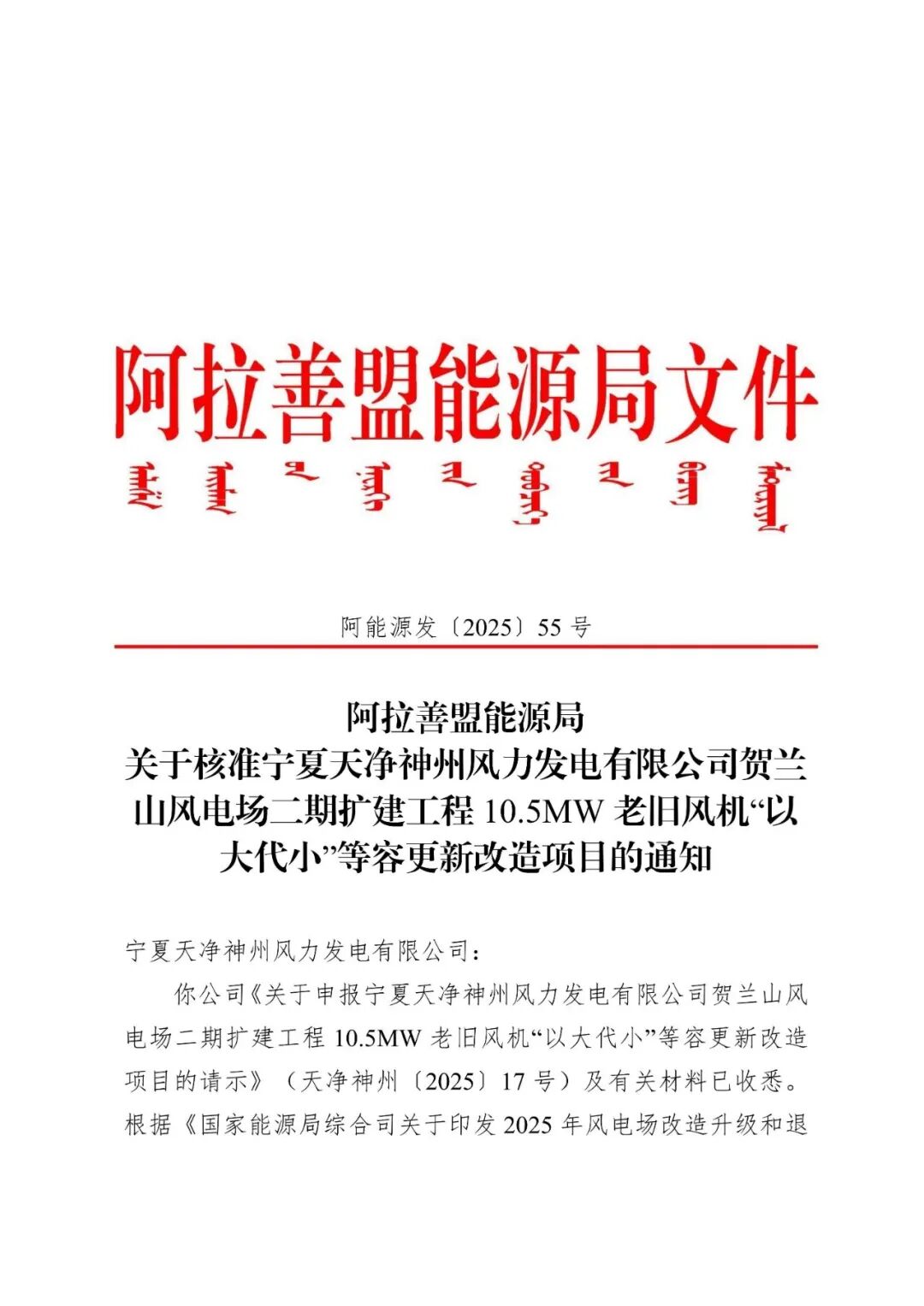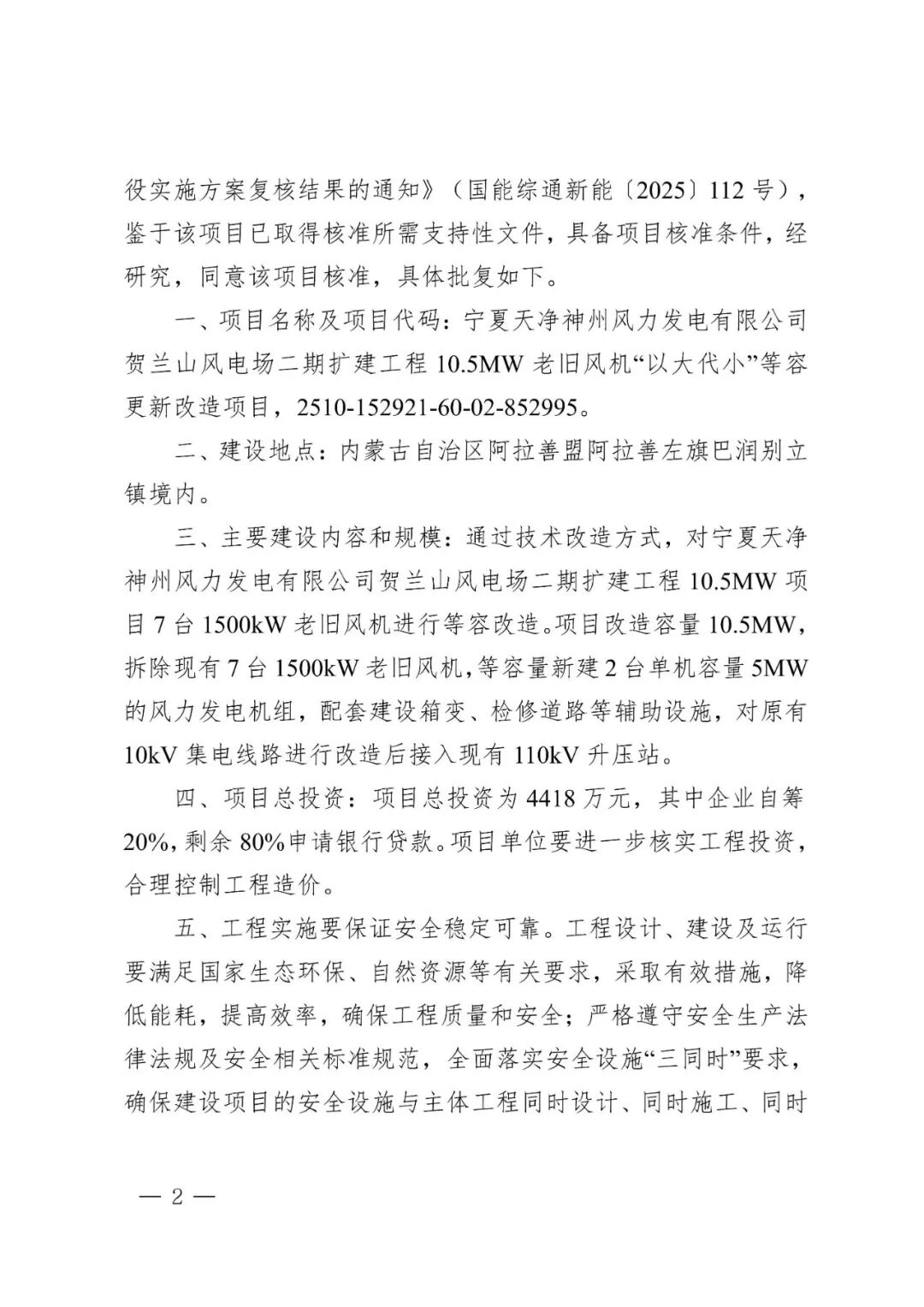 宁夏天净神州风力发电有限公司贺兰山风电场二期扩建工程10.5MW老旧风机“以大代小”等容更新改造项目位于内蒙古自治区阿拉善盟阿拉善左旗巴润别立镇境内,通过技术改造方式,对宁夏天净神州风力发电有限公司贺兰山风电场二期扩建工程10.5MW项目7台1500kW老旧风机进行等容改造。项目改造容量10.5MW,拆除现有7台1500kW老旧风机,等容量新建2台单机容量5MW的风力发电机组,配套建设箱变、检修道路等辅助设施,对原有10kV集电线路进行改造后接入现有110kV升压站。项目单位为宁夏天净神州风力发电有限公司,总投资为4418万元。