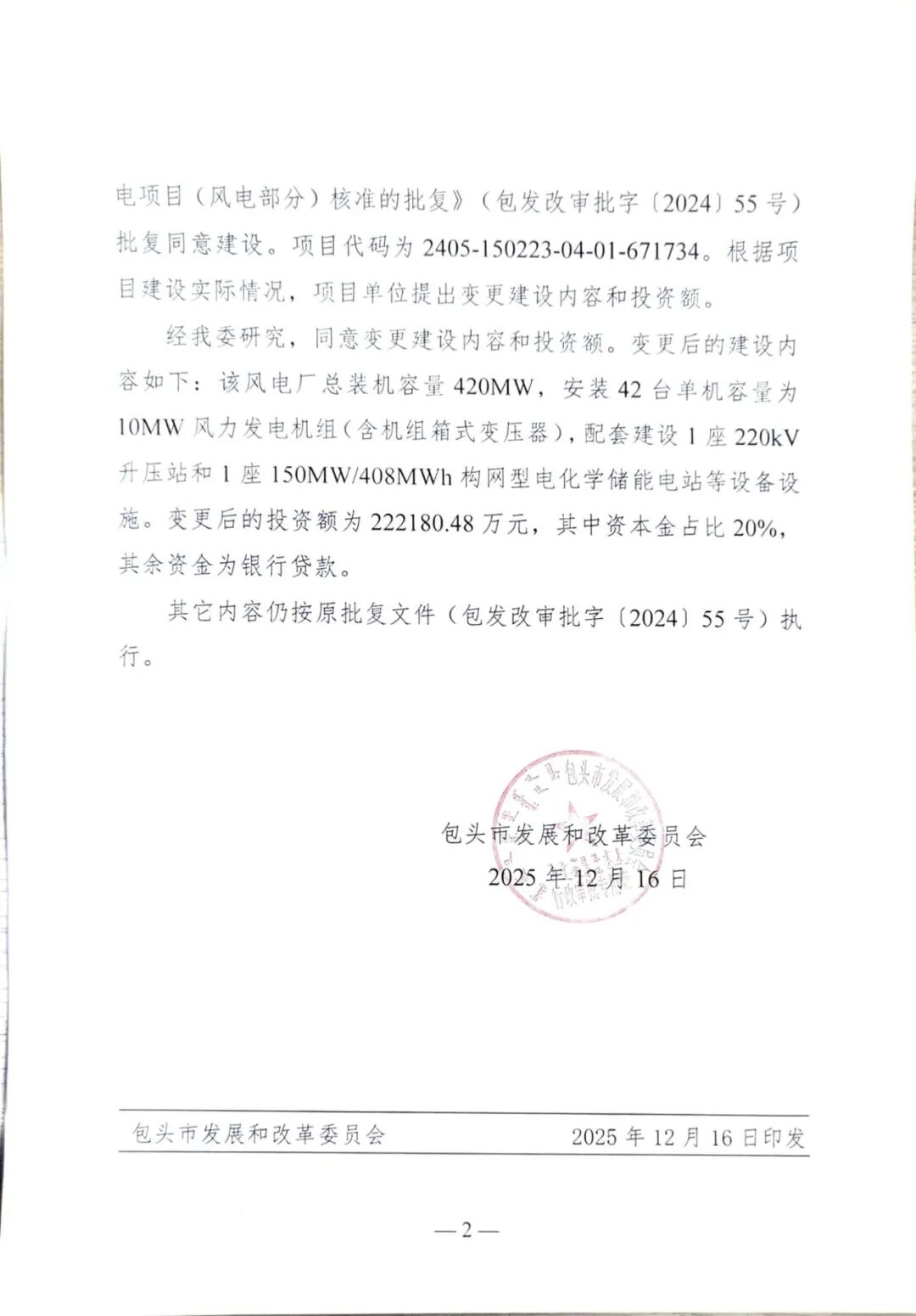 根据文件,双良包头市60万千瓦园区绿色供电项目(风电部分)项目单位为国电电力(达茂旗)新能源有限公司,变更后总装机容量420MW,安装42台单机容量为10MW风力发电机组(含机组箱式变压器),配套建设1座220kV升压站和1座150MW/408MWh构网型电化学储能电站等设备设施。变更后的投资额为222180.48万元。