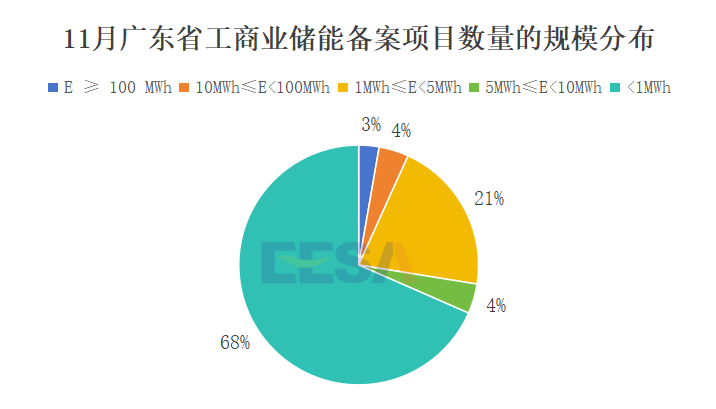 从备案结构看,11月广东省工商业储能备案项目数量的规模分布中,中小规模项目占据主体地位。其中,小于1MWh的项目占比约68%,1~5MWh项目占比约21%,合计接近九成,构成当月工商业储能备案的主要规模区间。