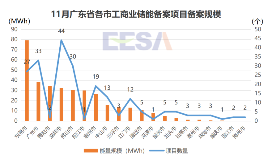 从市级分布看,广东省工商业储能备案呈现出明显的“制造业城市集中、头部城市领跑”的特征。备案项目主要分布在珠三角及部分产业基础较强的地市,项目数量与能量规模均向重点工业城市集中。其中,东莞、广州、佛山、深圳四市合计贡献了全省工商业储能备案项目数量的63%,成为工商业储能备案的核心来源。