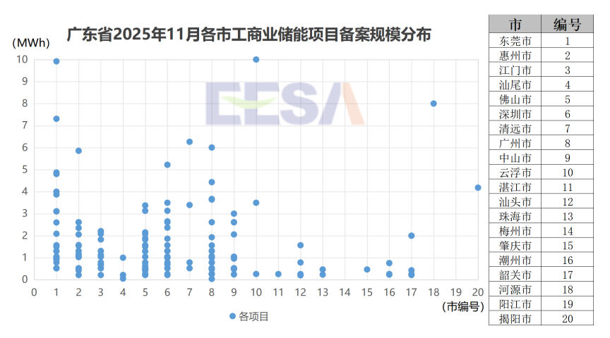 在此基础上,进一步从单体项目维度对规模分布进行观察,在剔除阳江市和揭阳市各30MWh的单体极端项目后,广东省11月各市工商业储能项目规模分布呈现出更加集中的特征。其余项目规模主要分布在0~5MWh区间内,1~3MWh项目占据主体,整体呈现“小而分散、贴近用户负荷”的典型工商业储能特征。整体来看,中小规模项目仍是广东省工商业储能备案的主要构成,说明当月工商业储能备案并非由普遍放量驱动,而是以常规中小规模项目稳步推进为主。