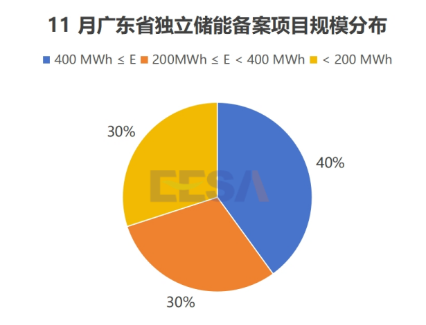从11月广东省独立储能备案项目规模分布来看,项目配置以中等规模为主。其中,400MWh以上项目占比约40%,为当月主要规模类型;200~400MWh项目占比约30%,与200MWh以下项目(约30%)共同构成中小规模独立储能的主体结构。
