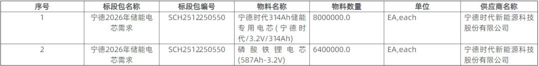 其中包括两个标段,标段一为宁德时代314Ah储能专用电芯800万块,约合8GWh;标段二为587Ah磷酸铁锂电芯640万块,约合12GWh,占了本次采购60%。两标段合约20GWh。