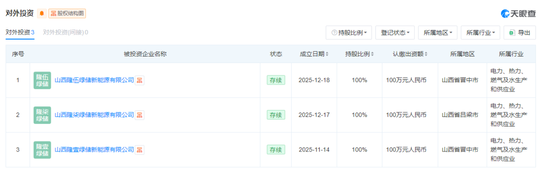 山西隆壹绿储新能源有限公司成立于2025年11月14日,所属地区为山西省晋中市;山西隆伍绿储新能源有限公司成立于2025年12月18日,所属地区山西省晋中市,山西隆柒绿储新能源有限公司成立于2025年12月17日,所属地区为山西省吕梁市;三家分公司均从事电力、热力、燃气及水生产和供应业为主。
