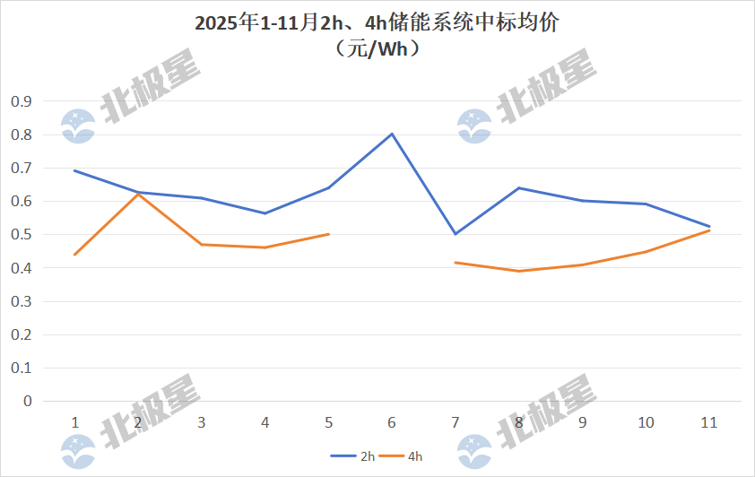 据北极星储能网数据显示,2025年1-11月国内储能系统平均中标价格约为0.593元/Wh,但与2024年11月国内储能系统均价0.56元/Wh相比,略有上涨趋势。