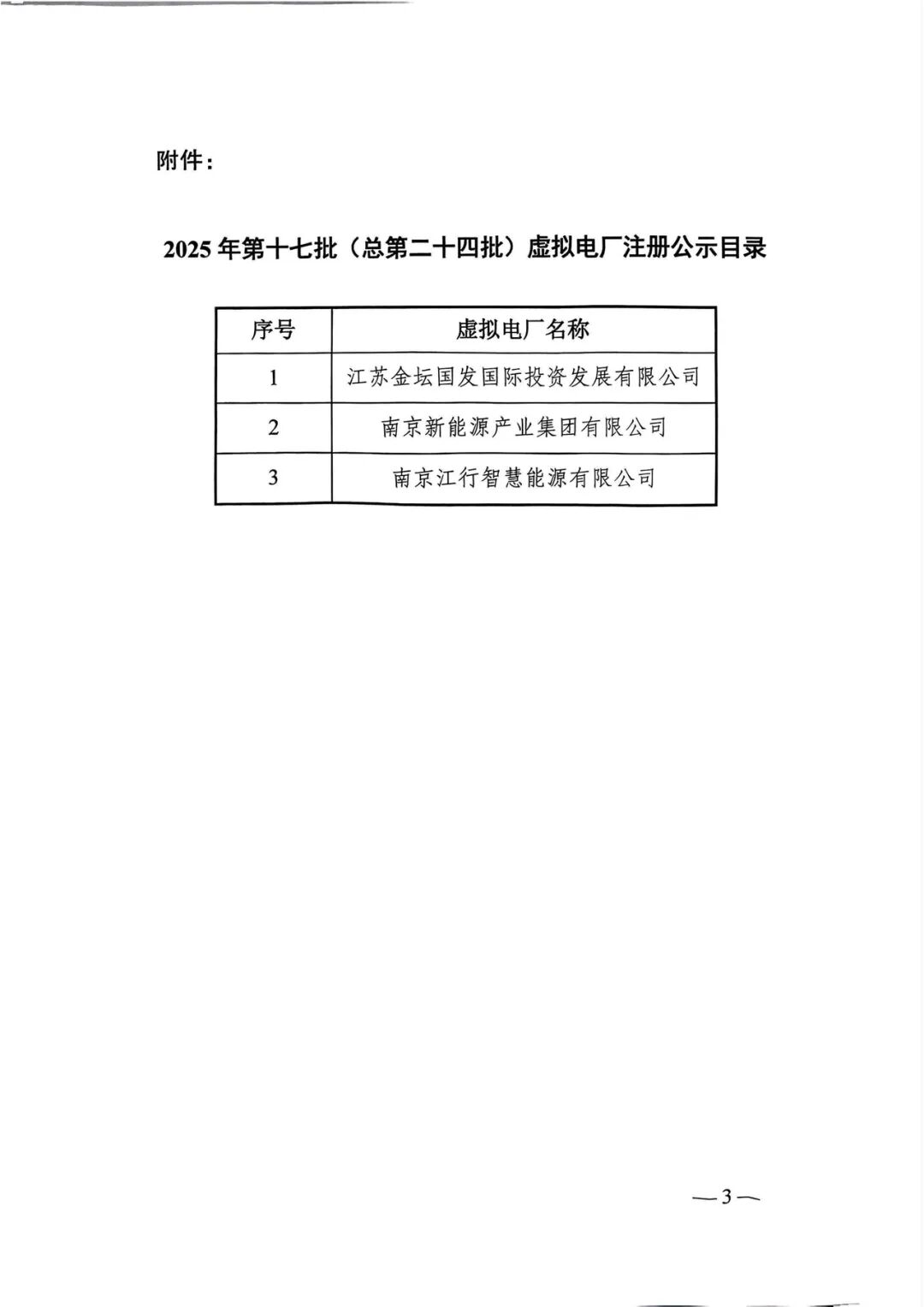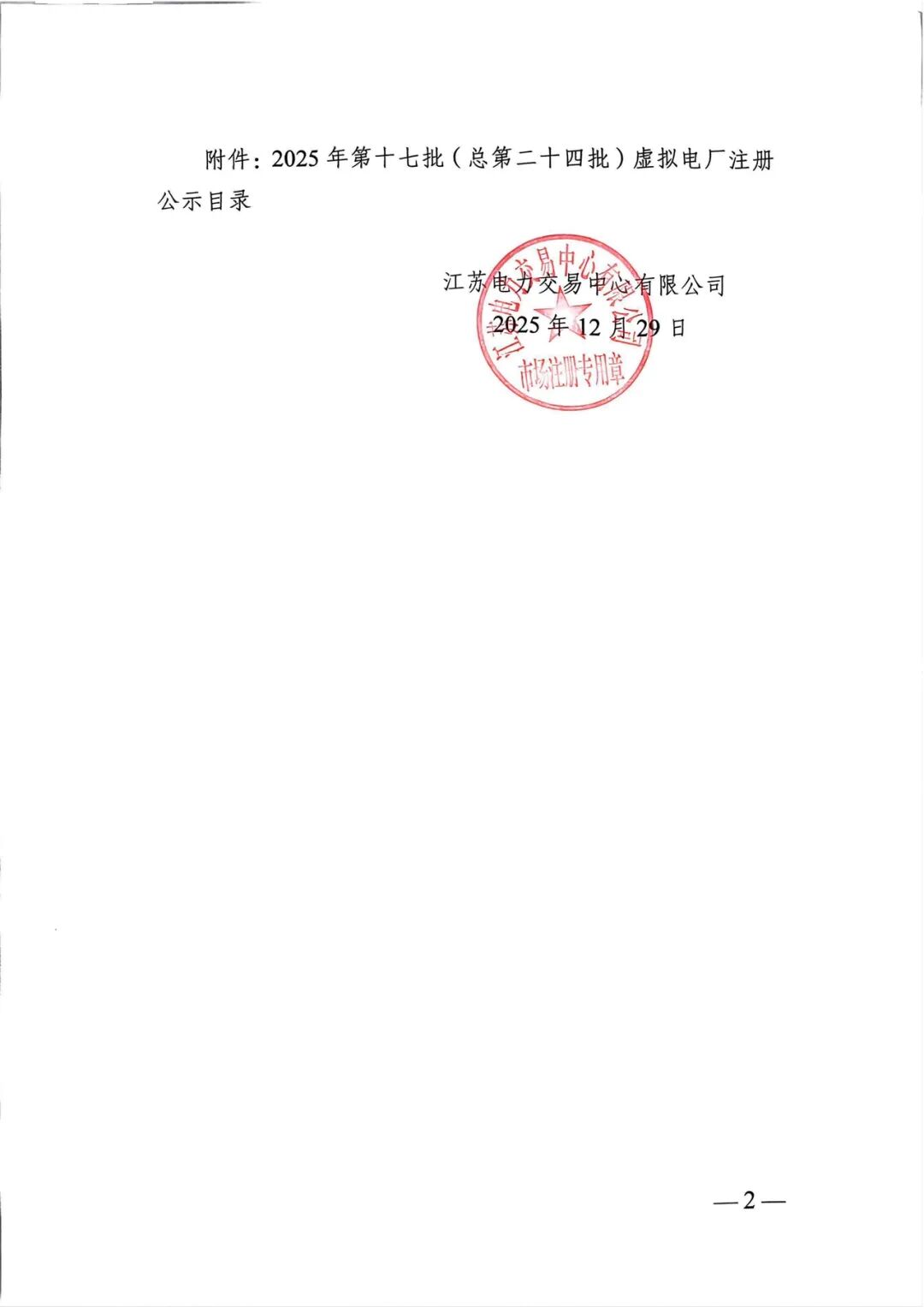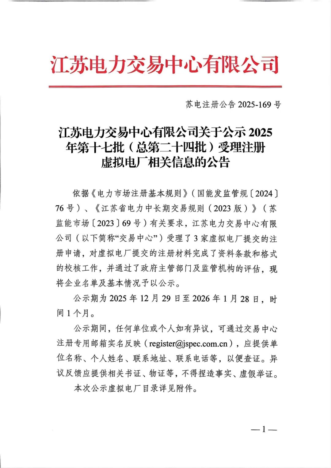 北极星电力市场网获悉,12月29日,江苏电力交易中心发布关于公示2025年第十七批(总第二十四批)受理注册虚拟电厂相关信息的公告。