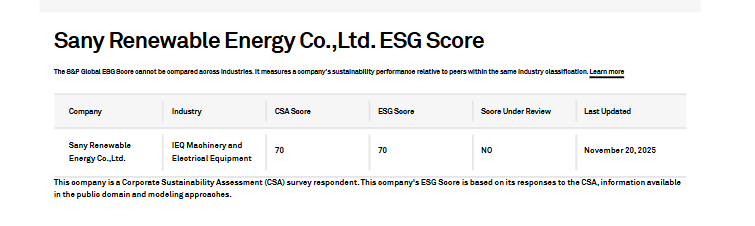 继4月入选标普全球(S&P Global)《可持续发展年鉴(中国版)2025》后,三一重能标普全球CSA评分跃升至70分,创历史最高。