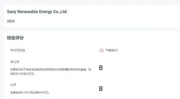 近日,全球环境信息研究中心(Carbon Disclosure Project,CDP)公布了2025年度全球企业环境信息问卷评级结果,三一重能凭借在气候变化应对领域的系统性实践与成效,斩获B级(管理级)评分。