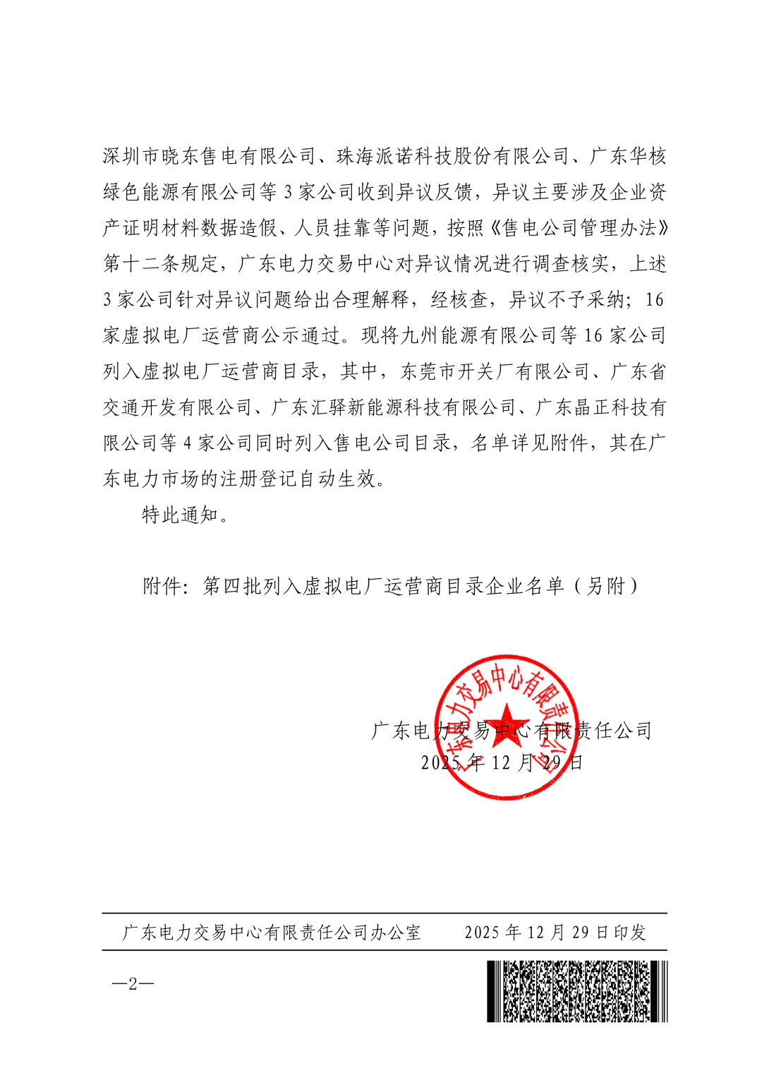 公示期间,九州能源有限公司等13家公司未收到异议反馈;深圳市晓东售电有限公司、珠海派诺科技股份有限公司、广东华核绿色能源有限公司等3家公司收到异议反馈,异议主要涉及企业资产证明材料数据造假、人员挂靠等问题,按照《售电公司管理办法》第十二条规定,广东电力交易中心对异议情况进行调查核实,上述3家公司针对异议问题给出合理解释,经核查,异议不予采纳:16家虚拟电厂运营商公示通过。现将九州能源有限公司等16家公司列入虚拟电厂运营商目录,其中,东莞市开关厂有限公司、广东省交通开发有限公司、广东汇驿新能源科技有限公司、广东晶正科技有限公司等4家公司同时列入售电公司目录,名单详见附件,其在广东电力市场的注册登记自动生效。