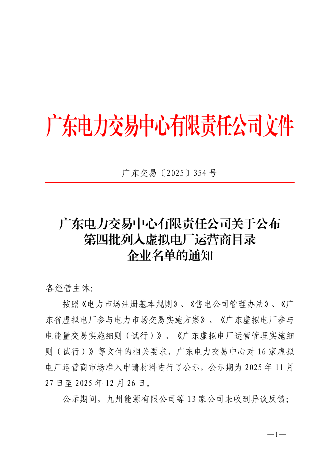 广东电力交易中心对16家虚拟电厂运营商市场准入申请材料进行了公示,公示期为2025年11月27日至2025年12月26日。