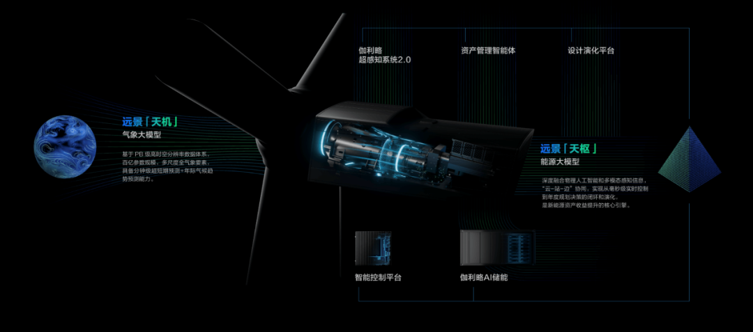 在风机技术创新方面,“136号文”的出台彻底改变了新能源电站运营逻辑,确定了风电项目的运营指标应该从“生产”升级为“收入”,应从传统的实发/应发的能量可利用率(EBA),变为实收/应收的收入可利用率(RBA)考核,这对风机的性能也提出了更高更新的要求。风资源、电价、负荷极强的时序性特征,要求企业能够为电站业主提供具备高精准度功率预测和电价预测能力的“产销一体”综合解决方案。2025年,远景正式推出搭载“远景天机”气象大模型与“远景天枢”能源大模型的伽利略AI风机,为行业破解这一难题提供全新路径。“天机”气象大模型通过千卡算力与百亿参数,融合卫星、雷达、地面站等多模态数据及全球800GW能源资产数据,仅需3分钟即可生成未来15-30天的全球精准预报。结合风机实时运行数据的“反馈闭环”,预测精度持续优化,区域级高时空分辨率可以做到20米以内,可以显著提升7天以上的中长期气象预测准确性。 具备全局感知、系统洞察和持续进化能力的“天枢”能源大模型,则可以基于海量的天气、设备、电网和市场数据,运用图神经网络、时空模型和多模态Transformer等先进算法,实现云、边、端协同实时控制,提升储能和风机收益,优化电力交易和资产投资决策,扩大绿电消纳。