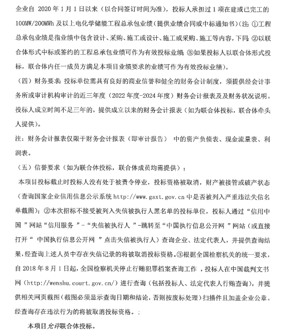 招标要求企业自2020年1月1日以来(以合同签订时间为准),投标人承担过1项在建或已完工的100MW/200MWh及以上电化学储能工程总承包业绩。