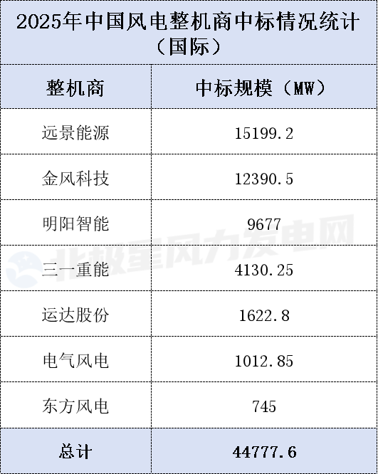 国际市场中,远景能源、金风科技、明阳智能位列2025年国际风电机组市场前三名。