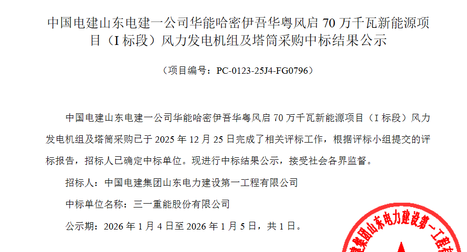 2026年1月4日,中国电建山东能源集团冠县一号风电项目(一期181.25MW)风力发电机组及附属设备采购项目、中国电建山东电建一公司华能哈密伊吾华粤风启 70 万千瓦新能源项目(I 标段)风力发电机组及塔筒采购中标结果公示,总装机容量581.25MW。
