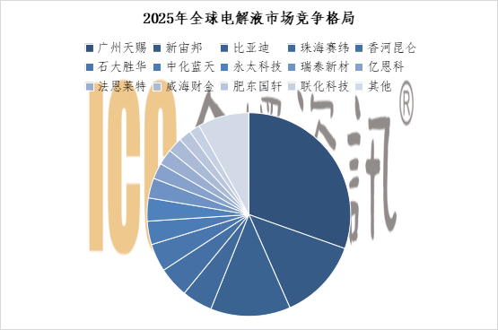 天赐材料仍然为全球最大的电解液供应商,其龙头地位短期内难以撼动。2025年天赐电解液产量达到72万吨,占全球电解液总产量的30.4%;比亚迪与新宙邦市场份额较为稳定,维持在13%左右;二梯队厂家竞争激烈,市场竞争格局随时发生改变。