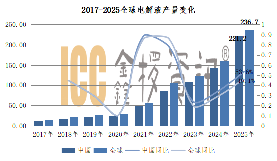电解液市场的快速增长,得益于下游需求的快速增加。根据ICC鑫椤锂电数据库统计:2025年全球电解液产量为236.7万吨,同比增长46.1%。2025年国内电解液总产量为221.2万吨,同比增长53.6%,国内产量占全球93%;储能电池产量的快速增长,带动电解液出货量猛增。