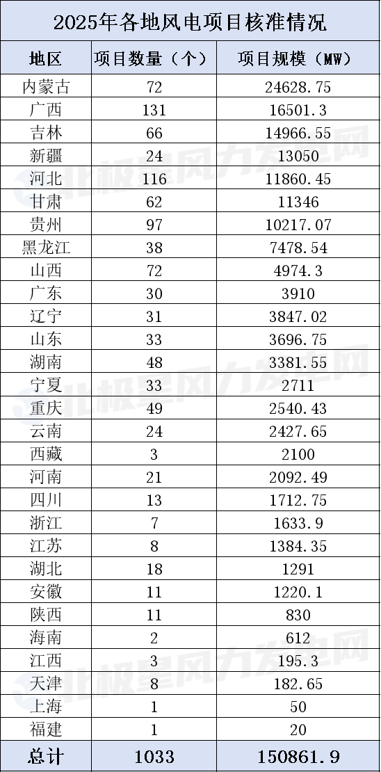 政策东风之下,我国风电项目核准进程全面提速。据北极星风力发电网不完全统计,2025年度全国共核准/备案风电项目1033个,总规模高达150861.9MW,超额兑现政策预期,为我国风电装机目标的完成筑牢坚实基础。