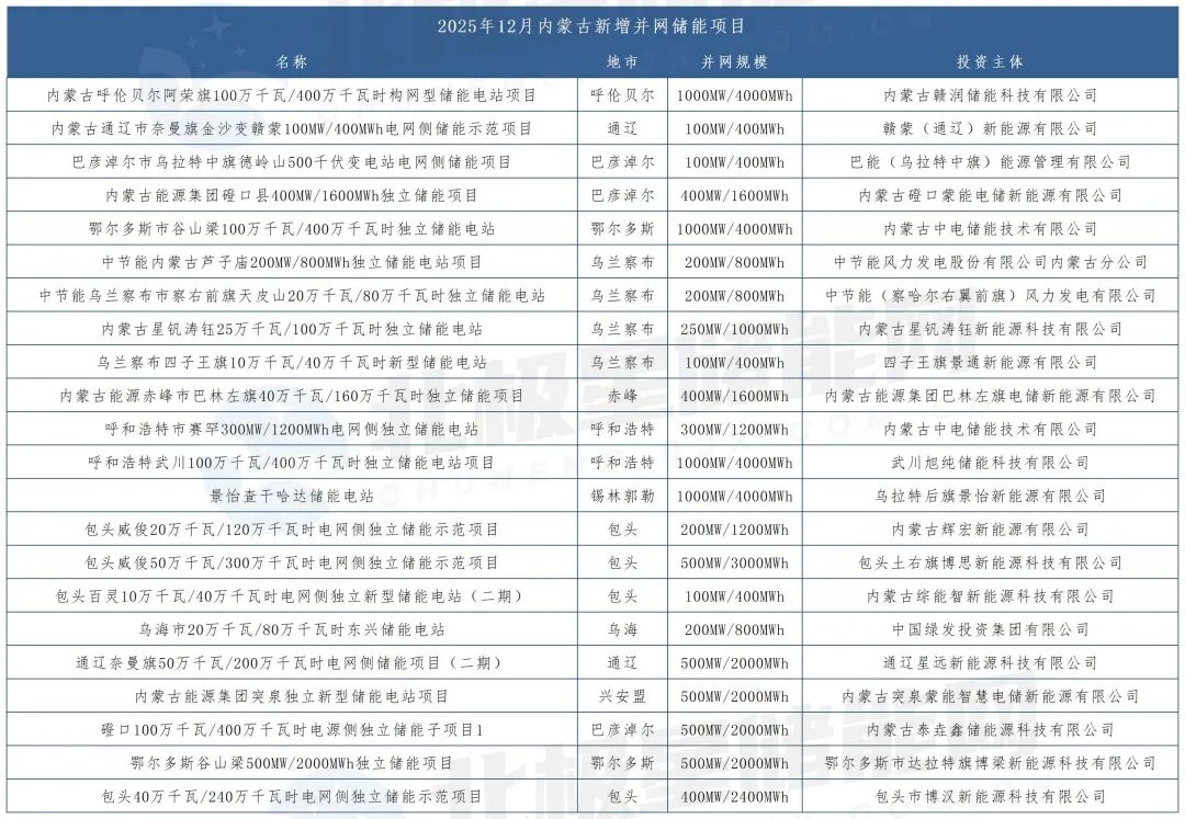 与此同时,内蒙古项目并网迎来密集收官期——12月以来,全区已有22个储能项目集中完成并网,新增储能规模达到9.45GW/40GWh。