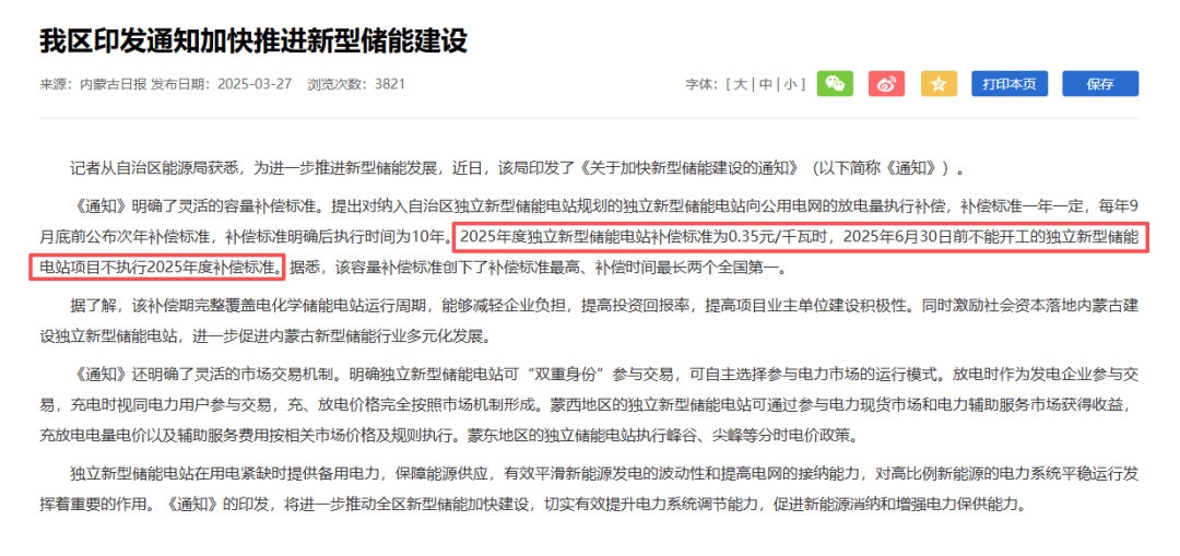 2025年3月内蒙古能源局出台政策,明确对6月30日前开工、12月31日前投产的独立新型储能电站给予0.35元/千瓦时的放电补偿,且补偿期长达10年,这一高收益政策直接成为项目推进的核心抓手。