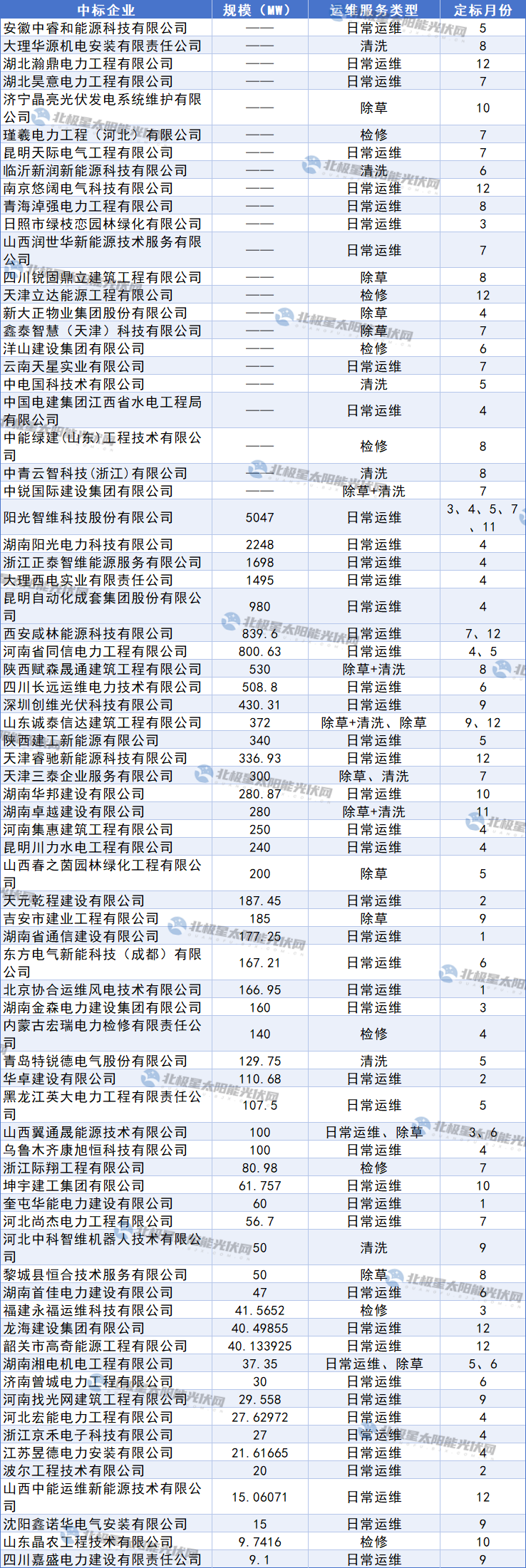 中标企业共计75家企业,阳光智维科技股份有限公司、湖南阳光电力科技有限公司、浙江正泰智维能源服务有限公司、大理西电实业有限责任公司4家企业订单规模合计10GW。