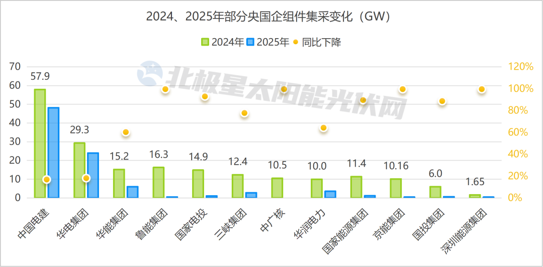 值得注意的是,2025年央国企组件集采规模处于10~20GW区间的企业仅有中国能建一家;而在2024年,这一区间的招标主体数量多达10家,除上述5家企业外,还涵盖鲁能、华能、国家电投、三峡集团、国家能源集团、中广核及京能集团等多家企业。
