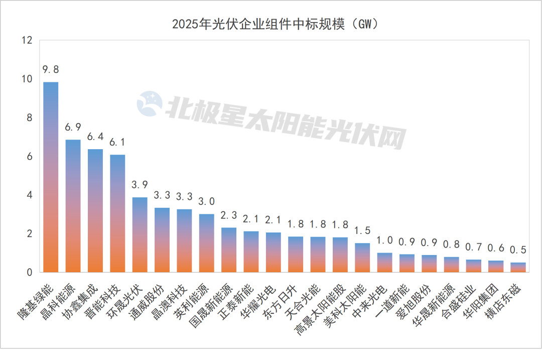 具体排名中,隆基以9.8GW的中标体量稳居榜首;晶科、协鑫、晋能科技中标规模均超6GW,位列头部阵营;此外,环晟、通威、晶澳、英利能源等企业的中标规模同样突破3GW。