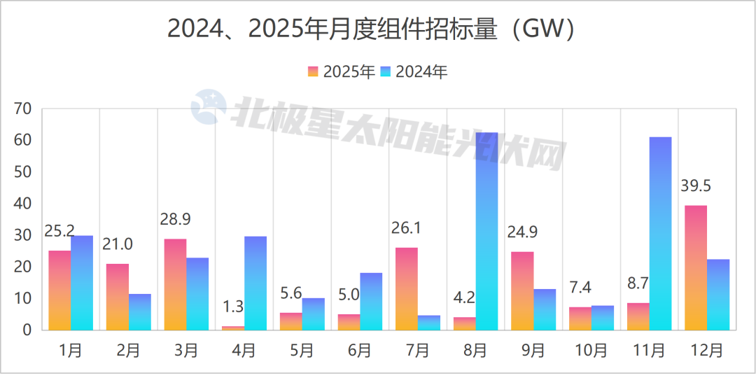 2025年的光伏行业依旧深陷“内卷”与调整的交织困局,价格博弈、技术迭代与需求波动的多重压力持续发酵,市场竞争态势愈发激烈。北极星光伏网基于全年公开招标与中标信息,系统梳理了2025年光伏组件招投标完整数据,通过规模变动、技术迭代、格局调整等核心维度的呈现,力图为行业解析背后的市场逻辑与趋势转向。