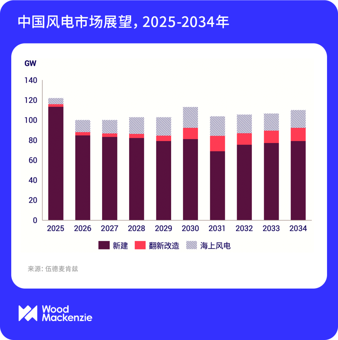 伍德麦肯兹最新研究显示,2025年中国新增风电并网容量将创新高,有望达到122GW。由于部分基地项目建设进度延误以及海上风电市场持续受到用海冲突影响,10个省份面临无法实现“十四五”风电或可再生能源装机目标的风险。
